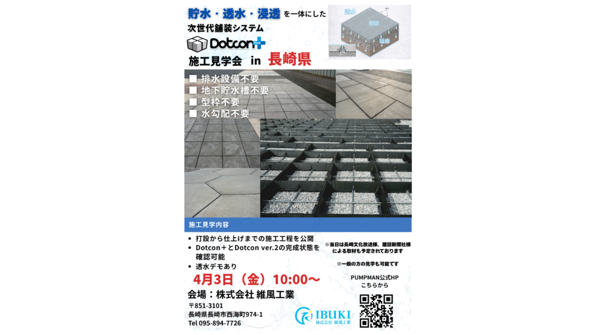 貯水・透水・浸透を一体化した次世代舗装システム「Dotcon+」の施工見学会を開催いたします。実際の施工工程から完成状態までを一度にご覧いただける貴重な機会です。 開催概要 日時:2026年3月25日(水)10:00~ 会場:株式会社 維風工業 ( 弊社駐車場 ) 住所:〒851-3101 長崎県長崎市西海町(にしうみまち)974-1 地図:https://maps.app.goo.gl/ 施工見学会内容 当日は以下の内容をご見学いただけます。 ・打設から仕上げまでの施工工程の公開 ・Do...